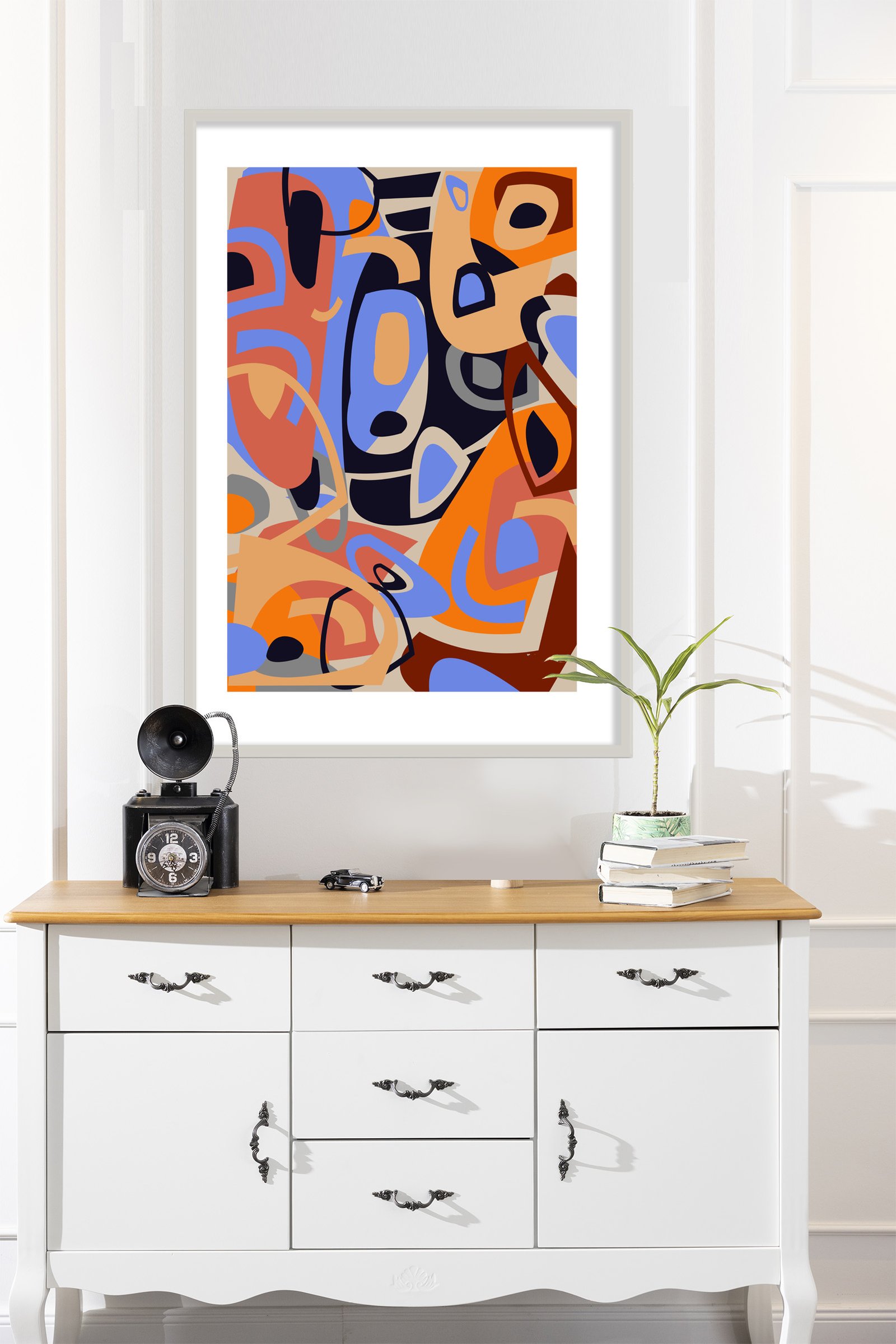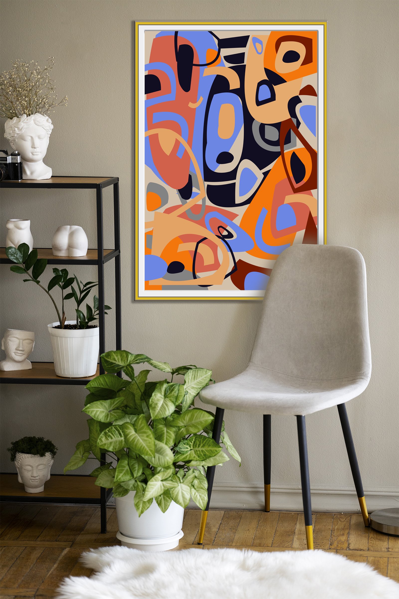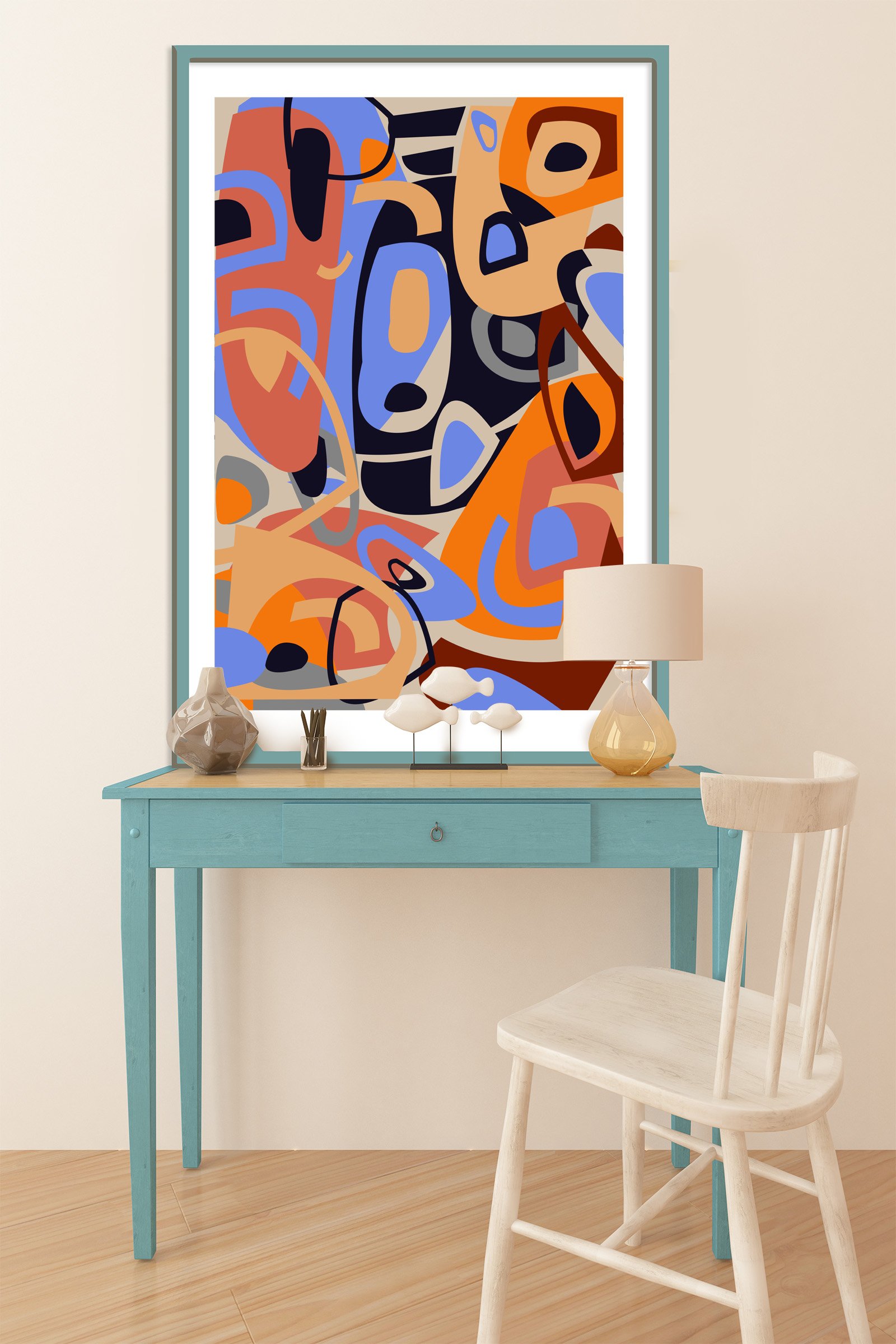 The secret to a welcoming atmosphere lies in the psychological impact of color. This artwork focuses on enhancing home decor with positive colors like warm oranges and soothing blues. Orange is known to promote creativity and social interaction, while blue provides a calming counter-balance that keeps a room feeling grounded.