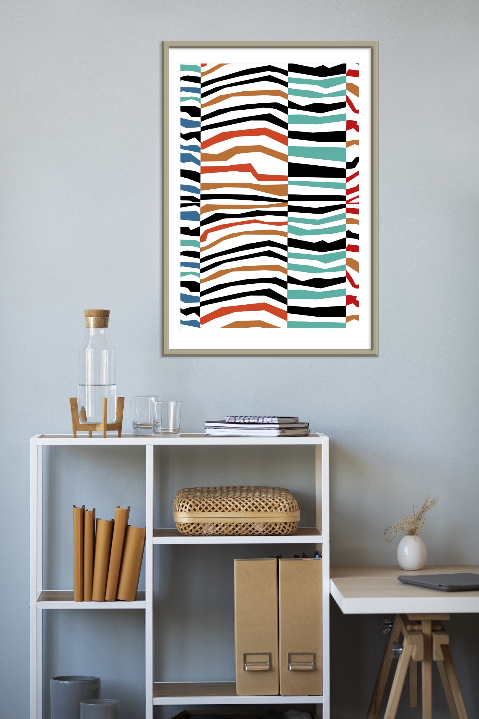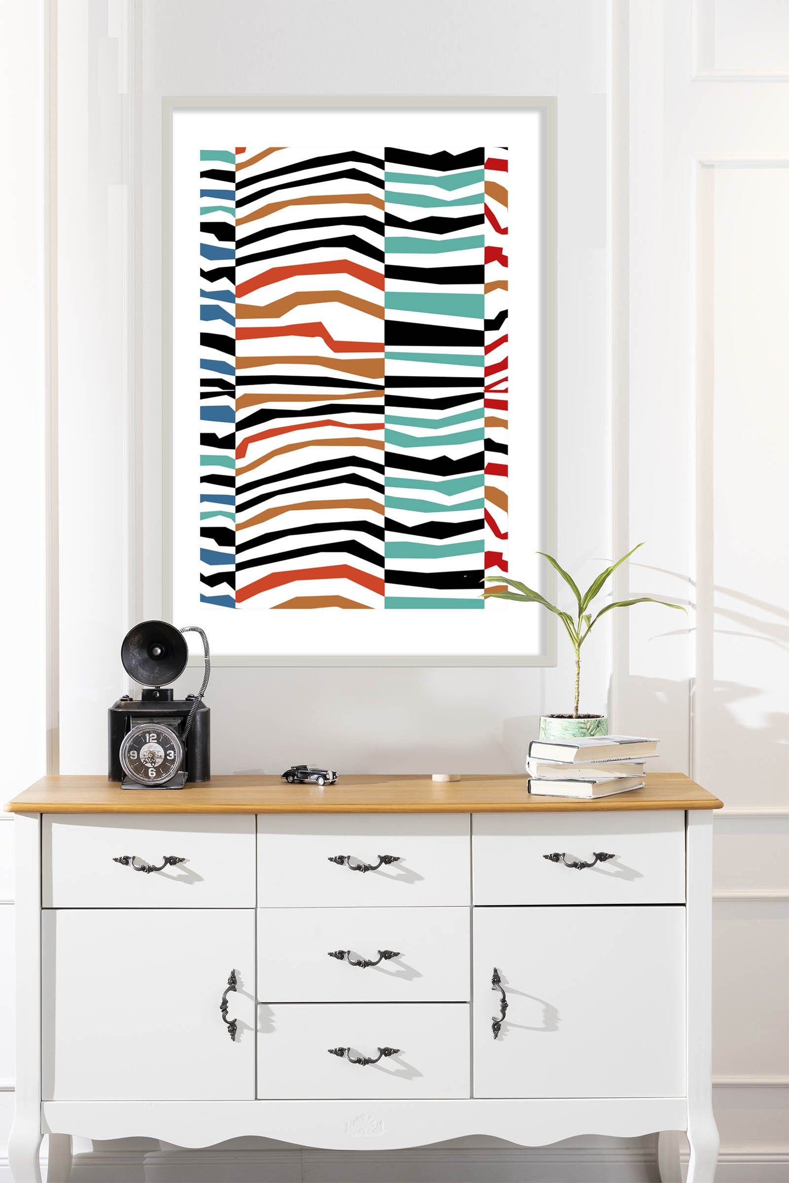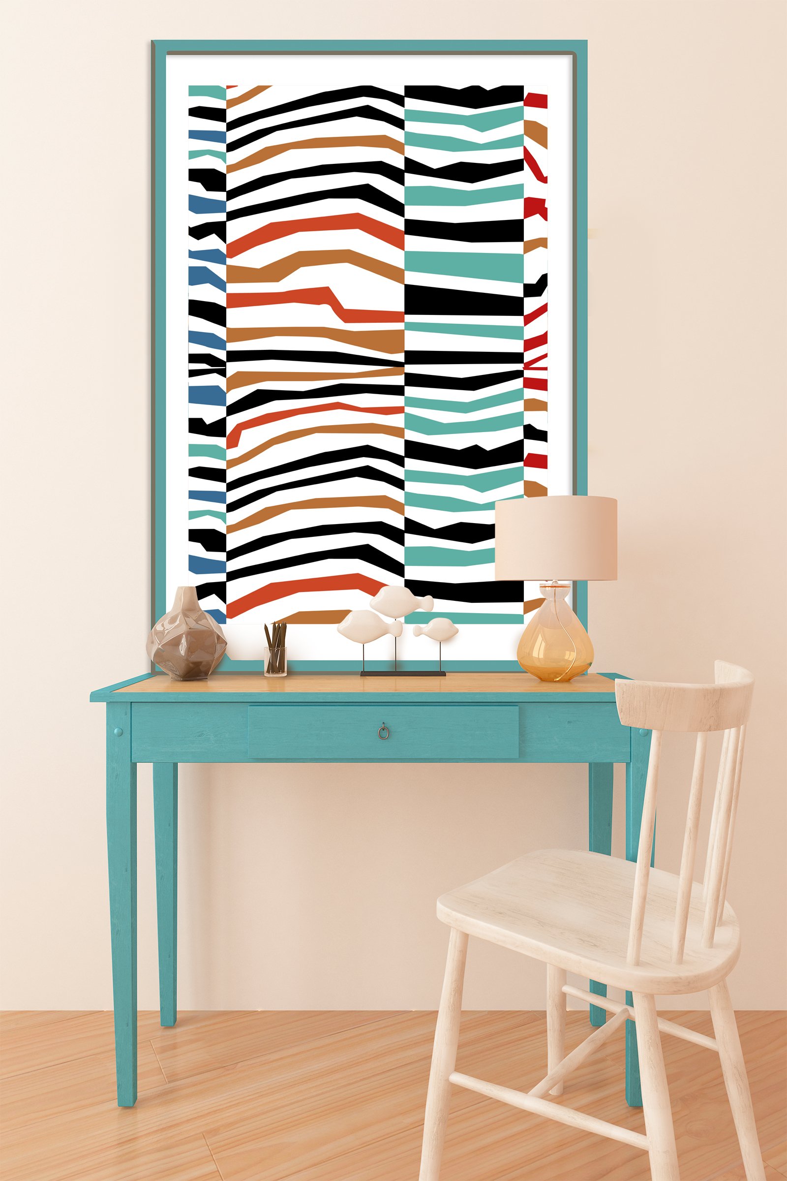 In addition to the striking shapes, the color selection plays a vital role in this composition. I combined earthy terracotta with deep teal and ocean blue to create a grounded yet adventurous feel. Since these hues are paired with stark black and white, the Endless Waves design feels both timeless and trendy. Furthermore, the vertical columns help organize the “fractured” wave-like patterns. Consequently, the art maintains a sense of balance despite its high-energy appearance.