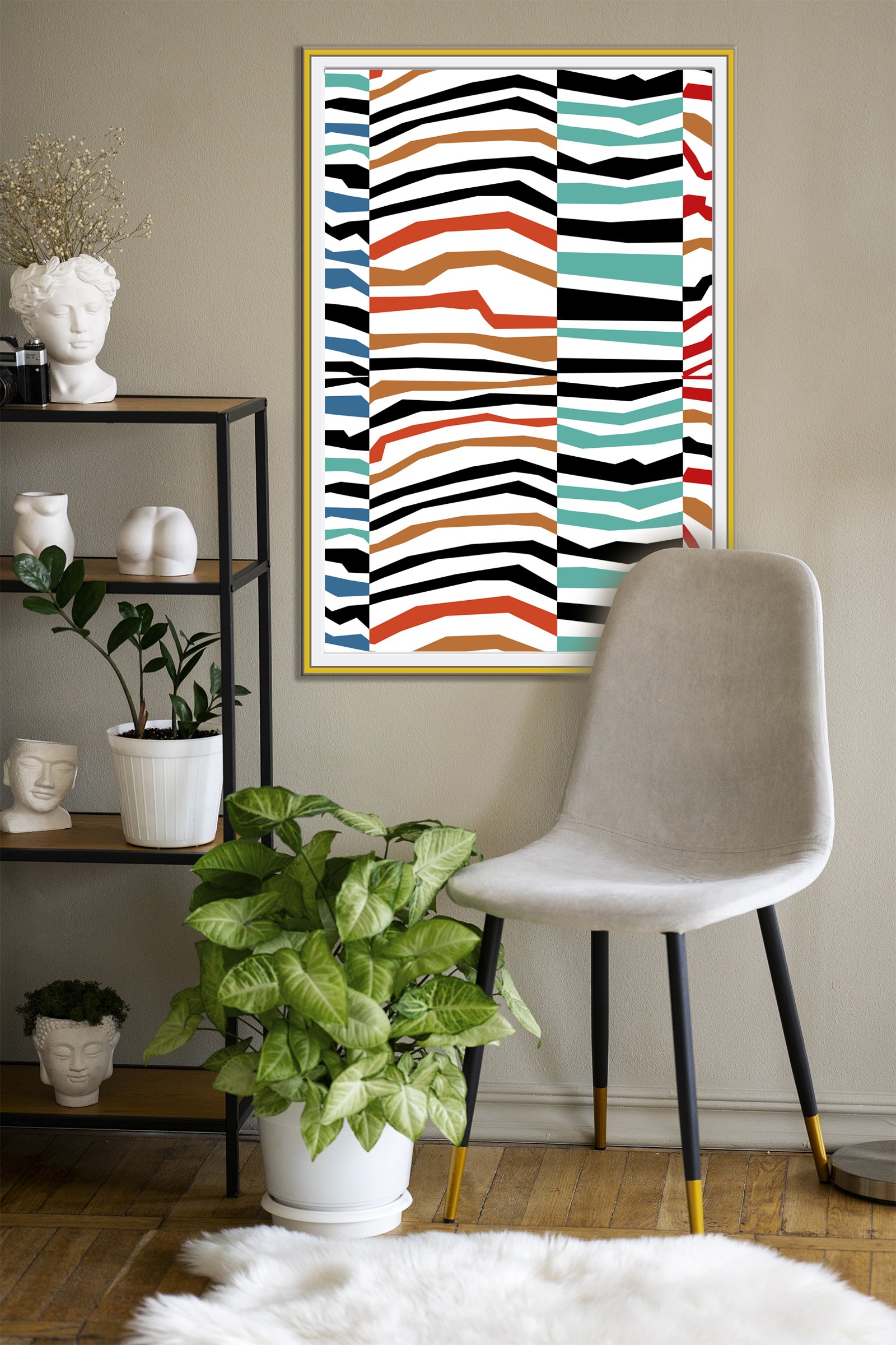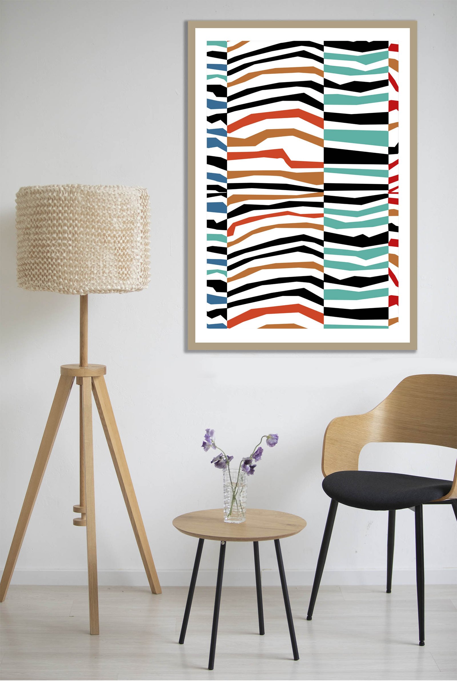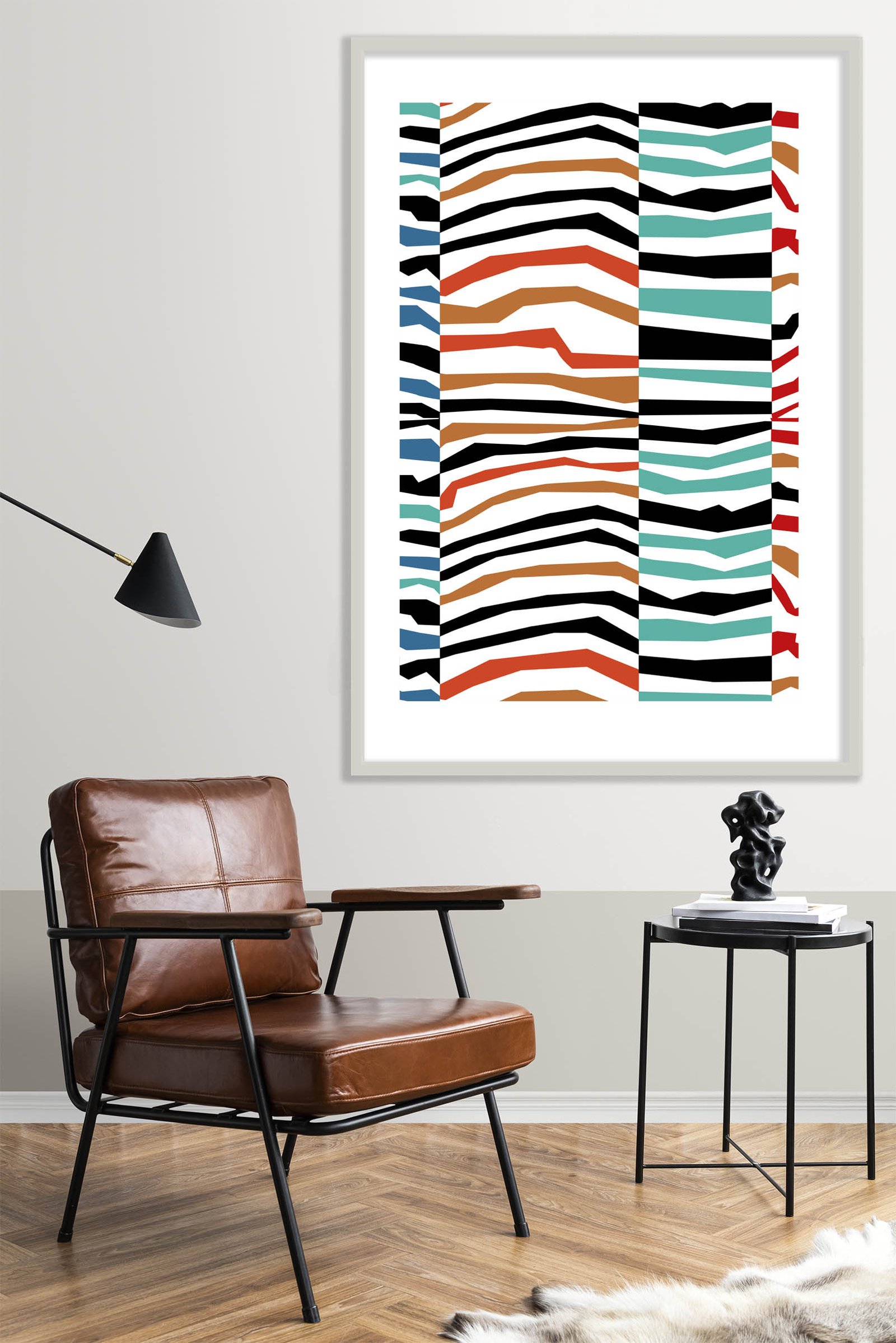 In addition to the striking shapes, the color selection plays a vital role in this composition. I combined earthy terracotta with deep teal and ocean blue to create a grounded yet adventurous feel. Since these hues are paired with stark black and white, the Endless Waves design feels both timeless and trendy. Furthermore, the vertical columns help organize the “fractured” wave-like patterns. Consequently, the art maintains a sense of balance despite its high-energy appearance.