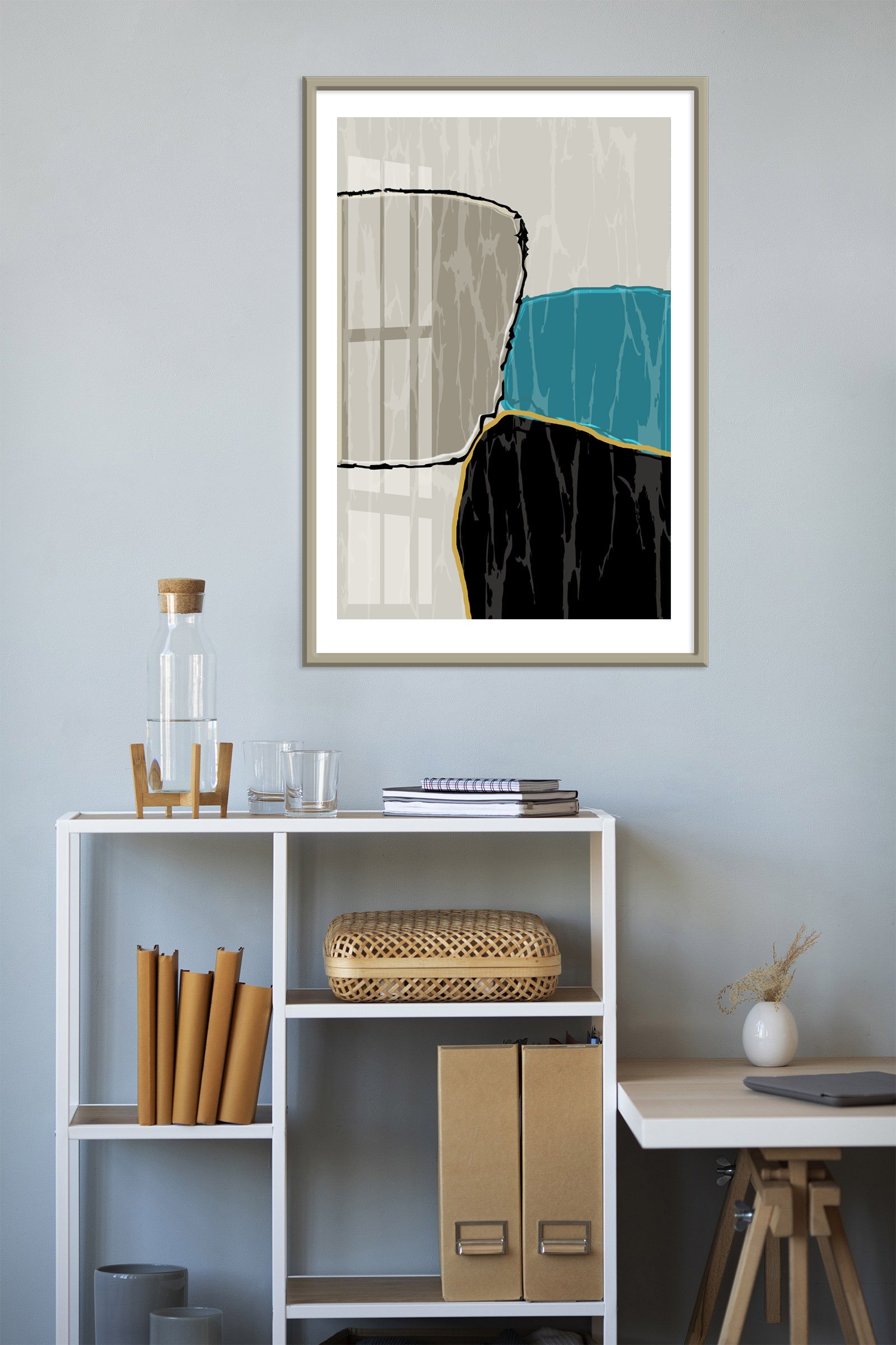 The artwork features a striking teal blue block set against deep black and neutral beige. A thin gold line cuts through the center, adding a touch of elegance to the rugged textures. These vertical lines mimic the weathered walls of a natural canyon. The organic shapes create a sense of movement and depth on the canvas.