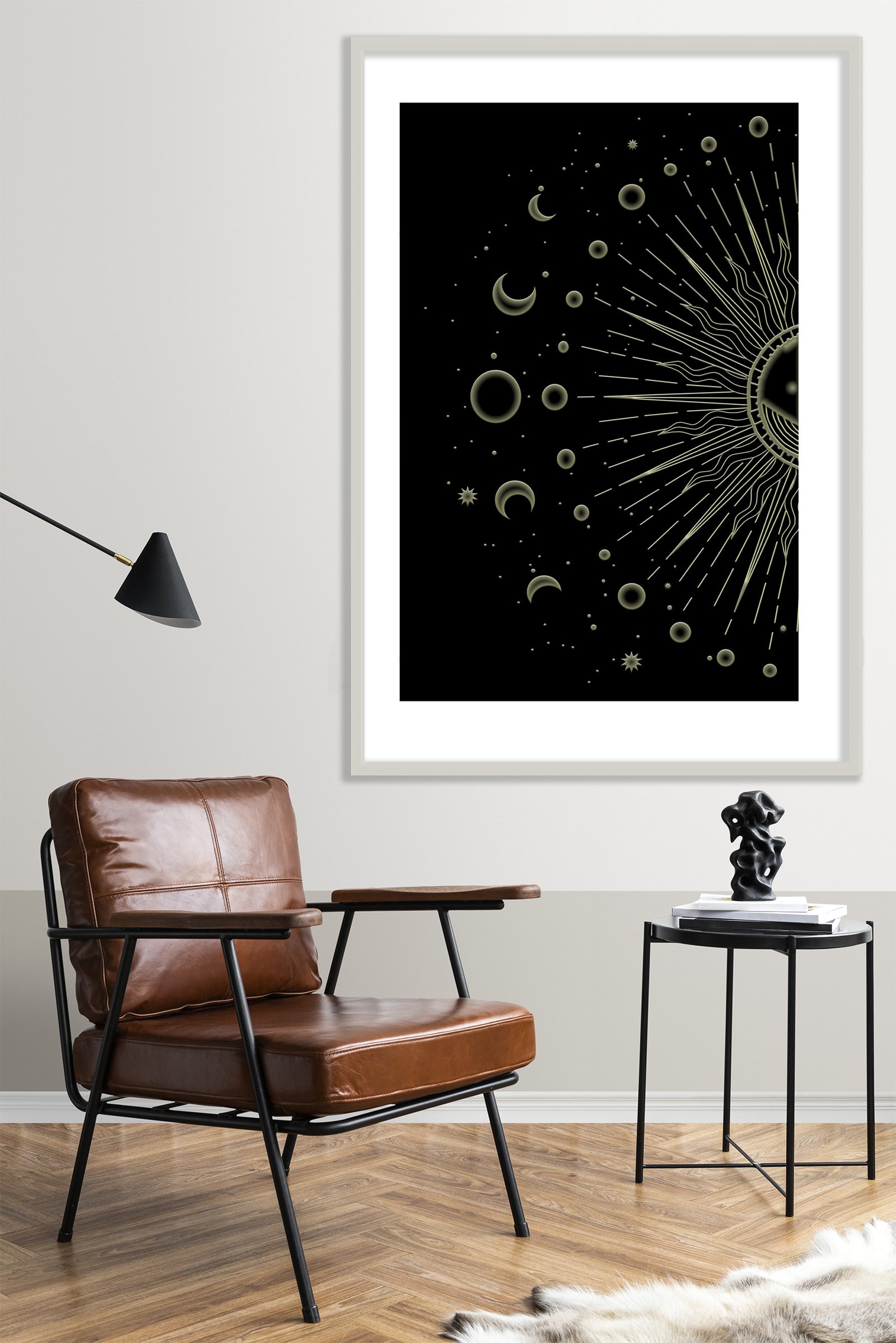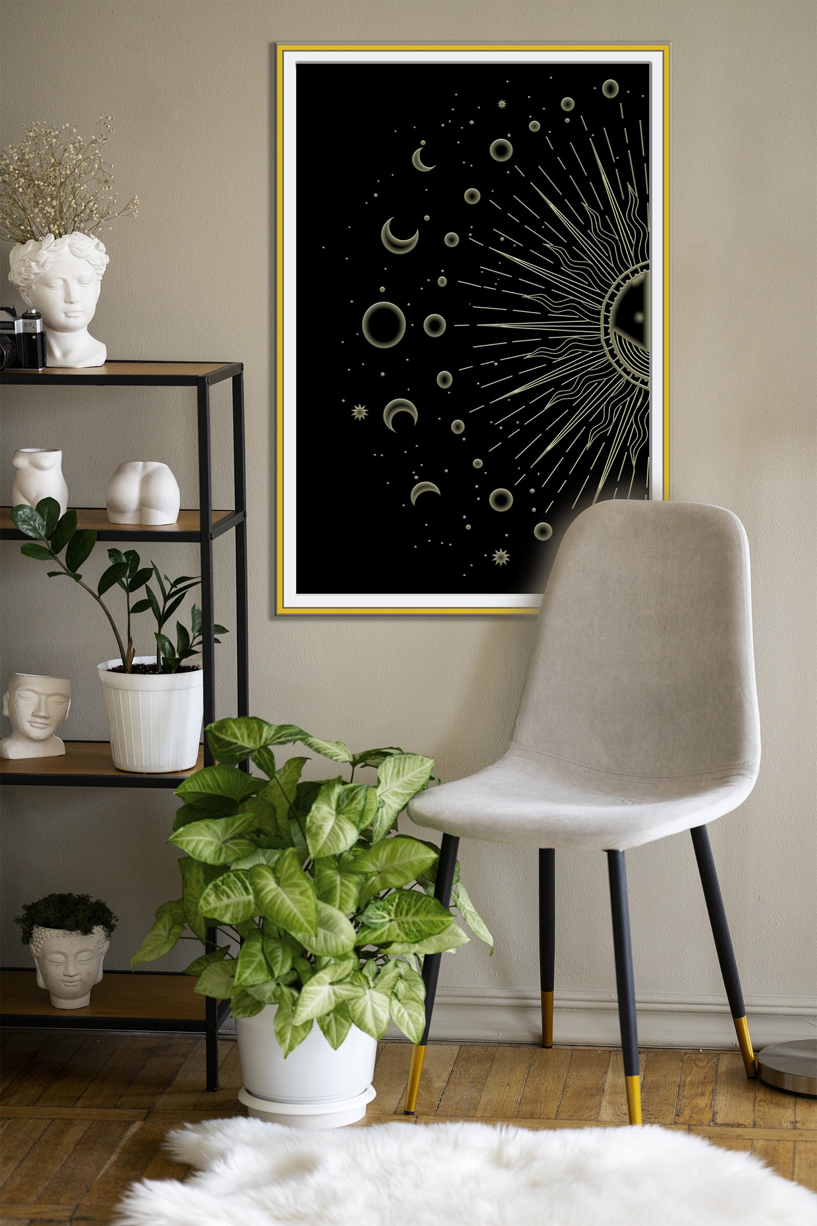 Choosing paintings for the best energy flow can transform the mood of your entire living space. The Lunar phrases artwork acts as a visual anchor for peace and mindfulness. Its high-contrast gold and black palette invites a sense of luxury and calm into any room. By placing this art on your wall, you invite the steady, cyclical energy of the cosmos into your daily life.
