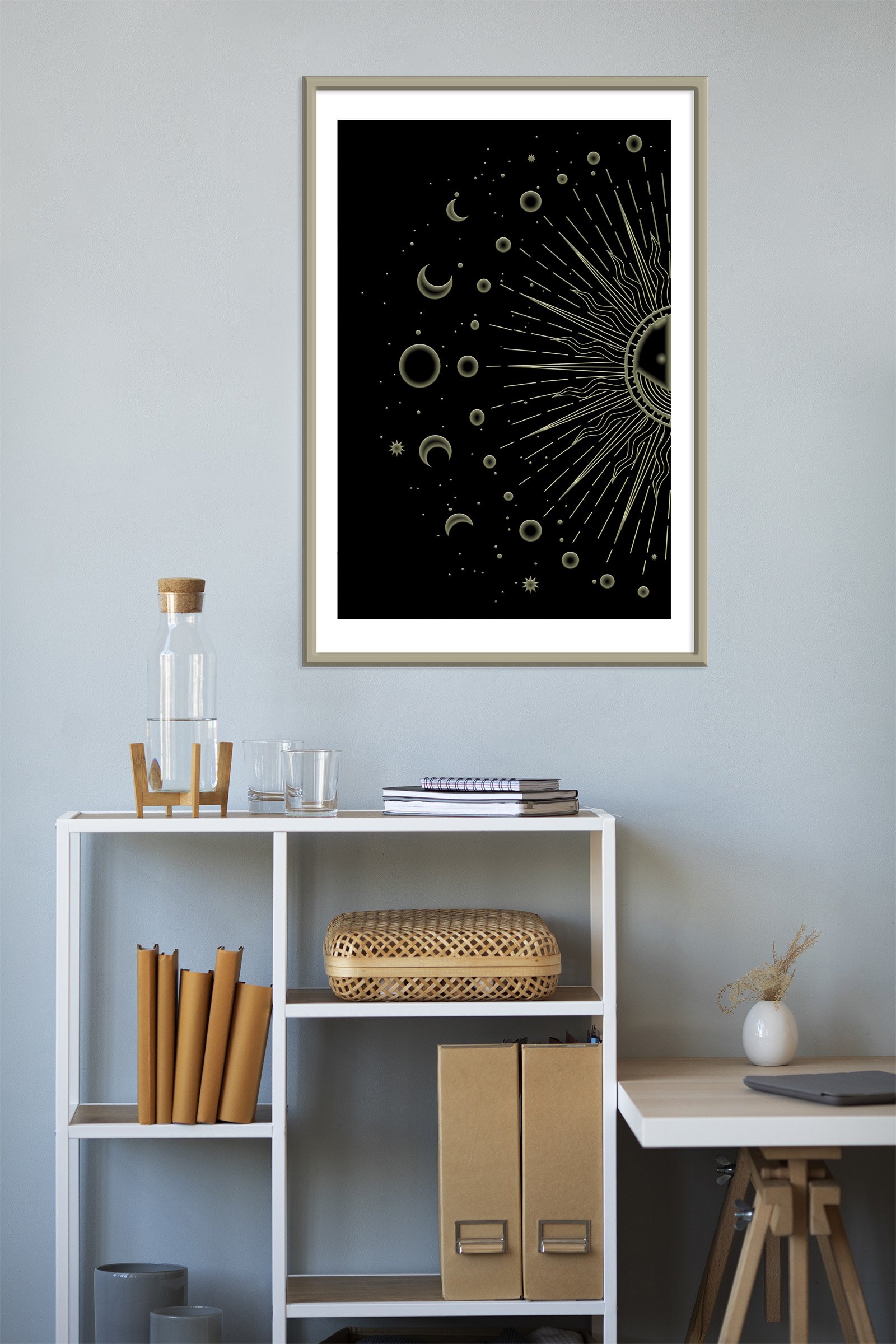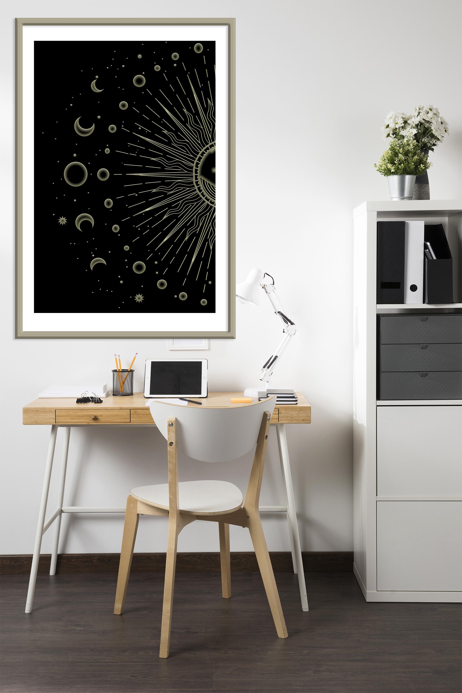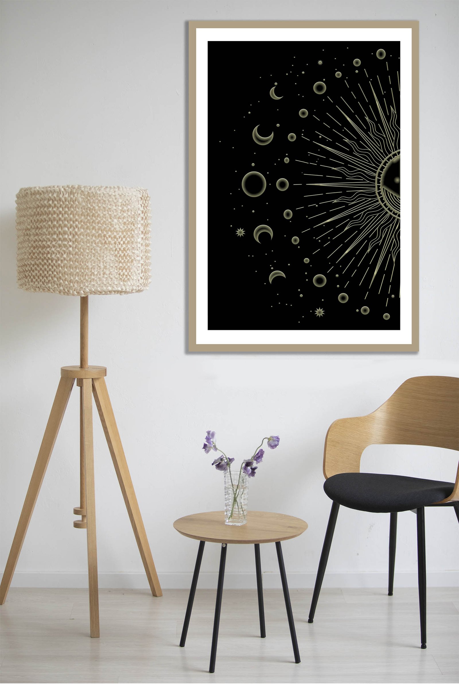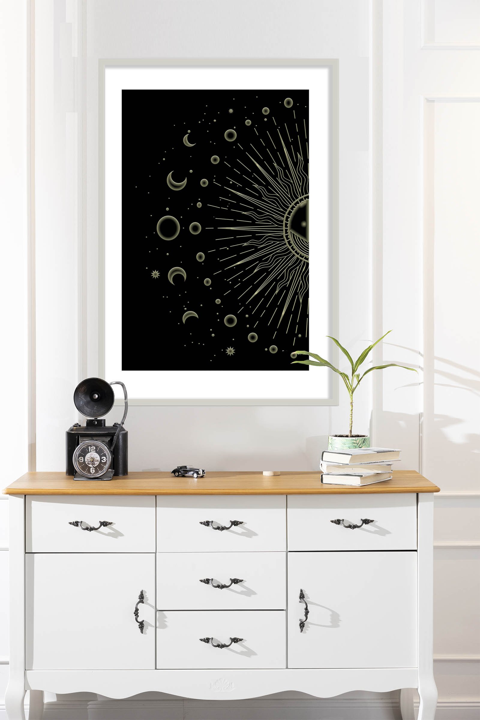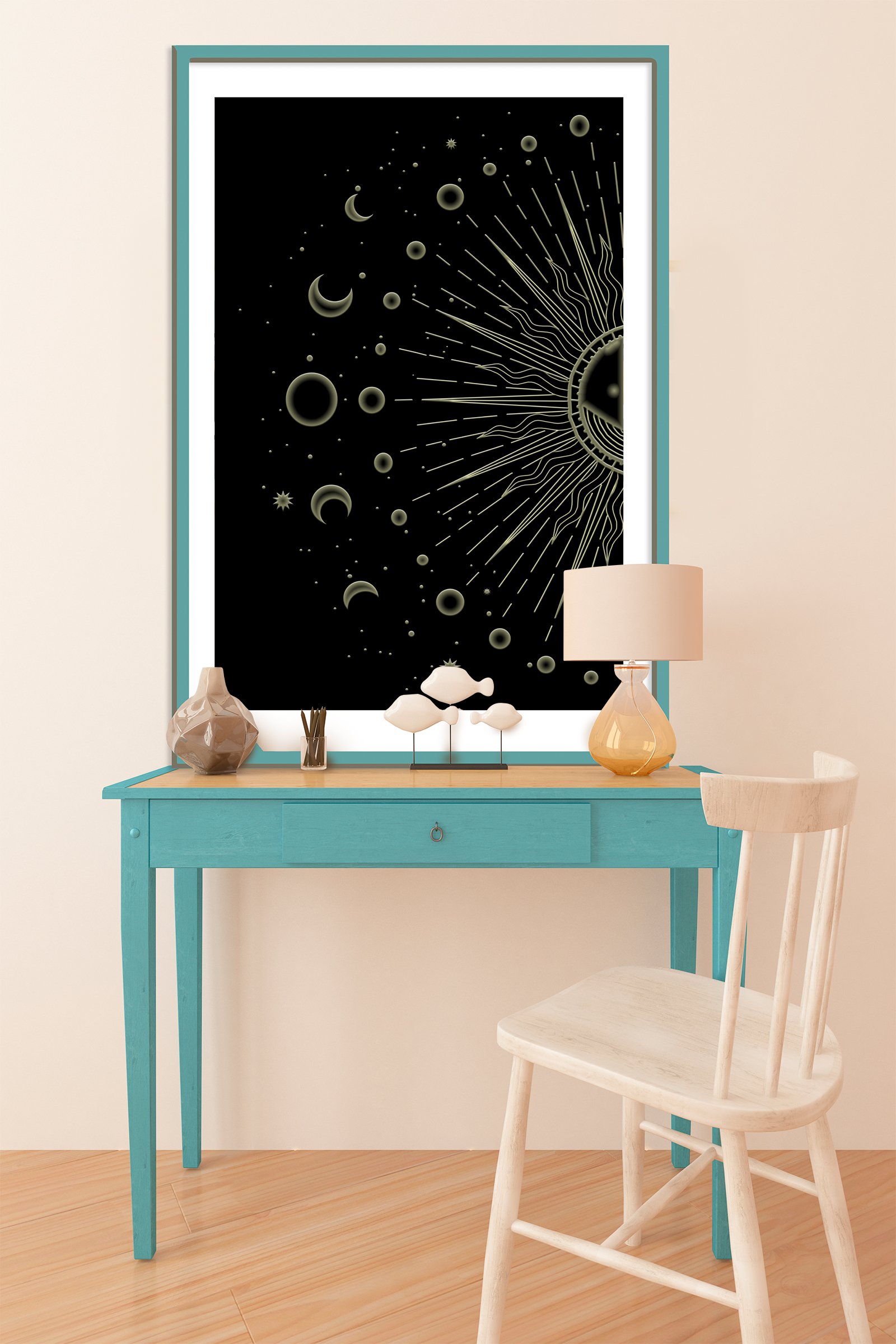 The Lunar phrases artwork is a perfect example of paintings for the best energy flow. This celestial piece uses the power of the moon and sun to create a balanced atmosphere. I designed this work to help you align your home with the natural rhythms of the universe. It features a glowing sun and detailed moon phases that symbolize growth and renewal.