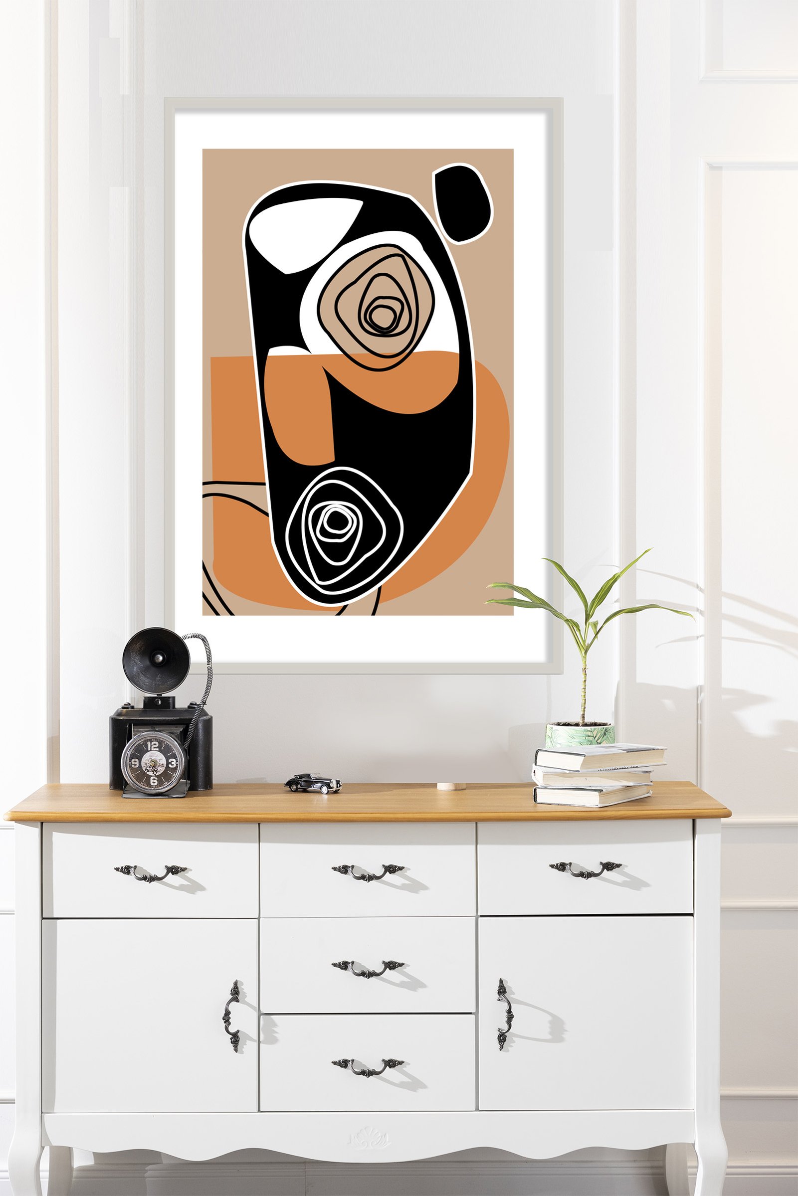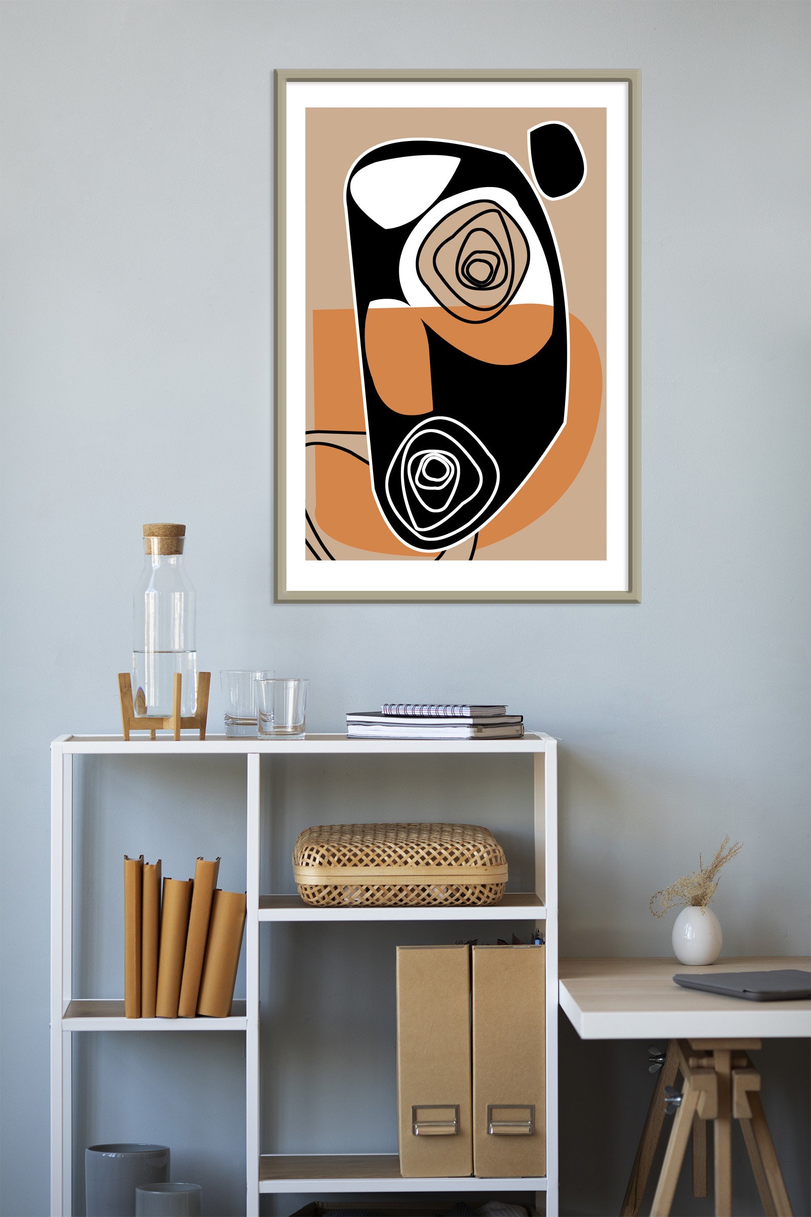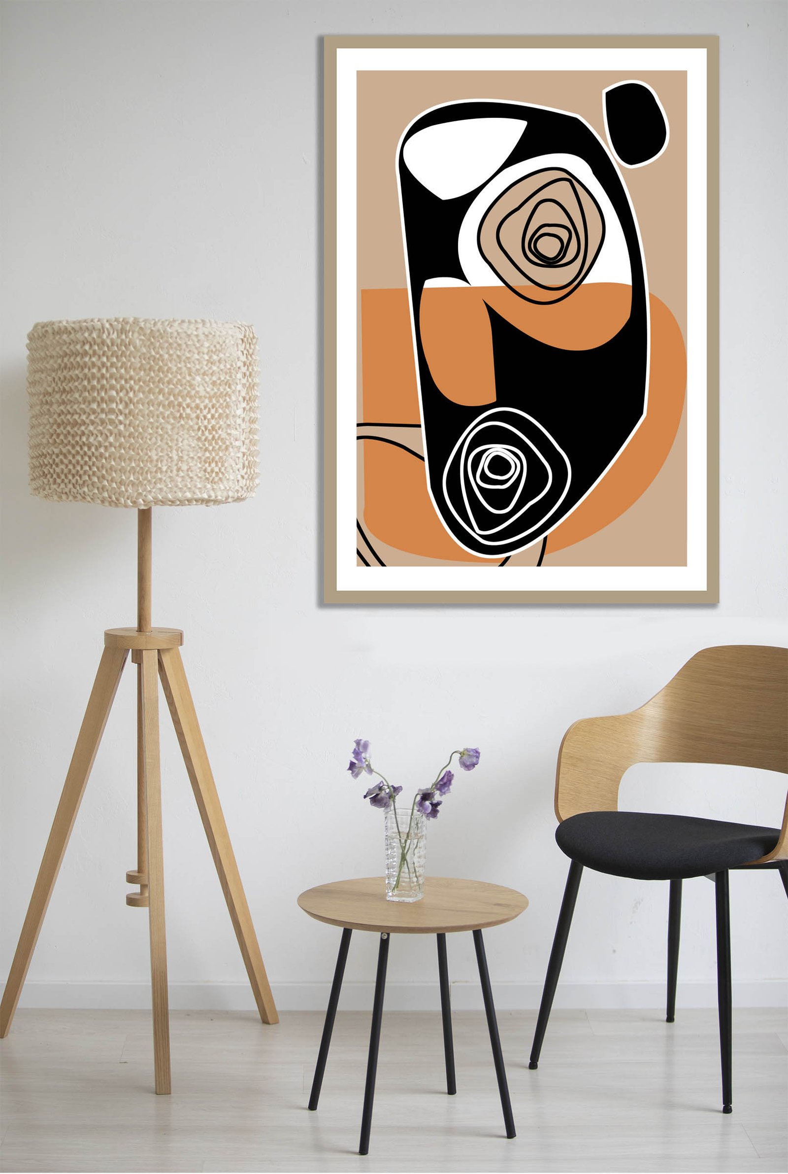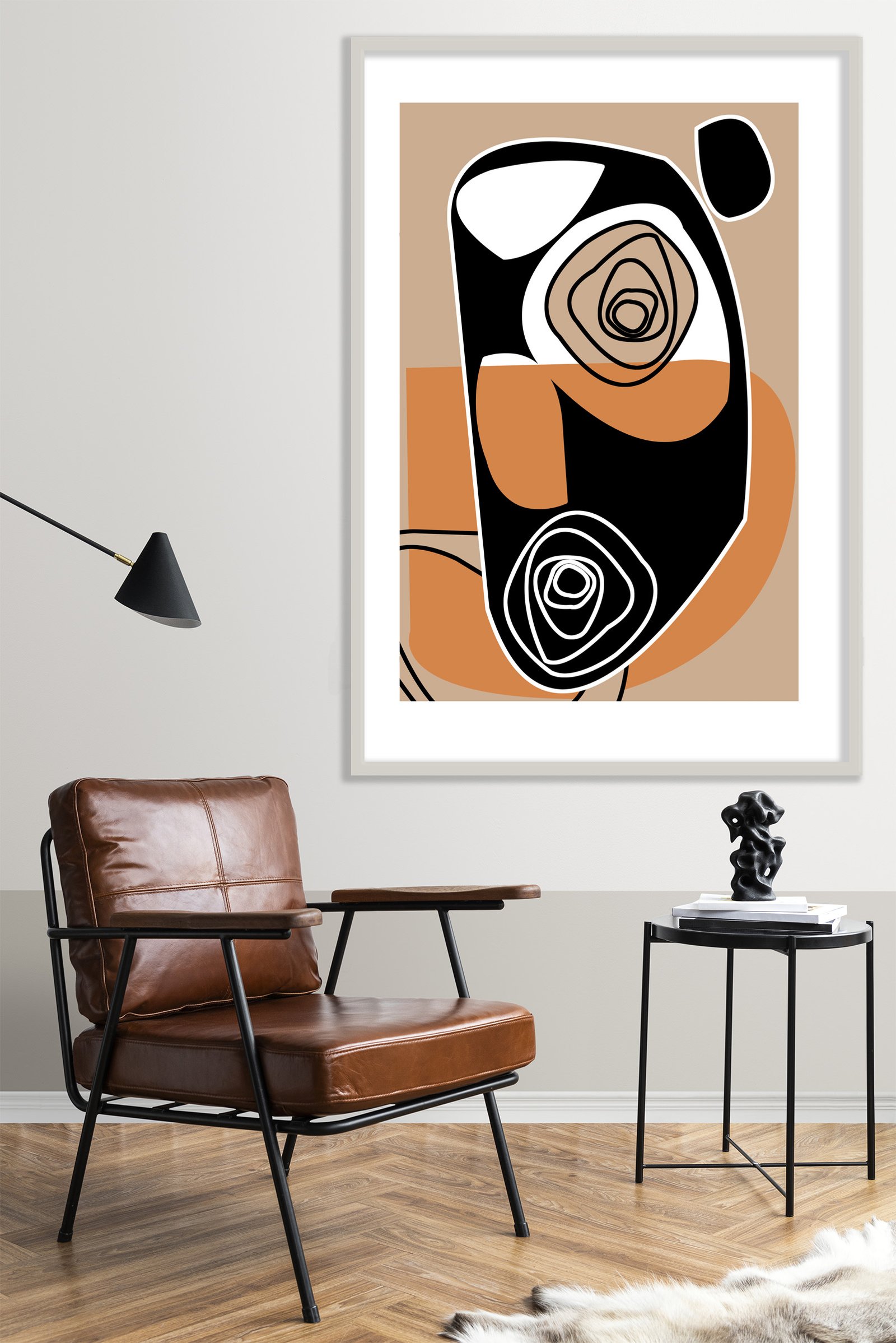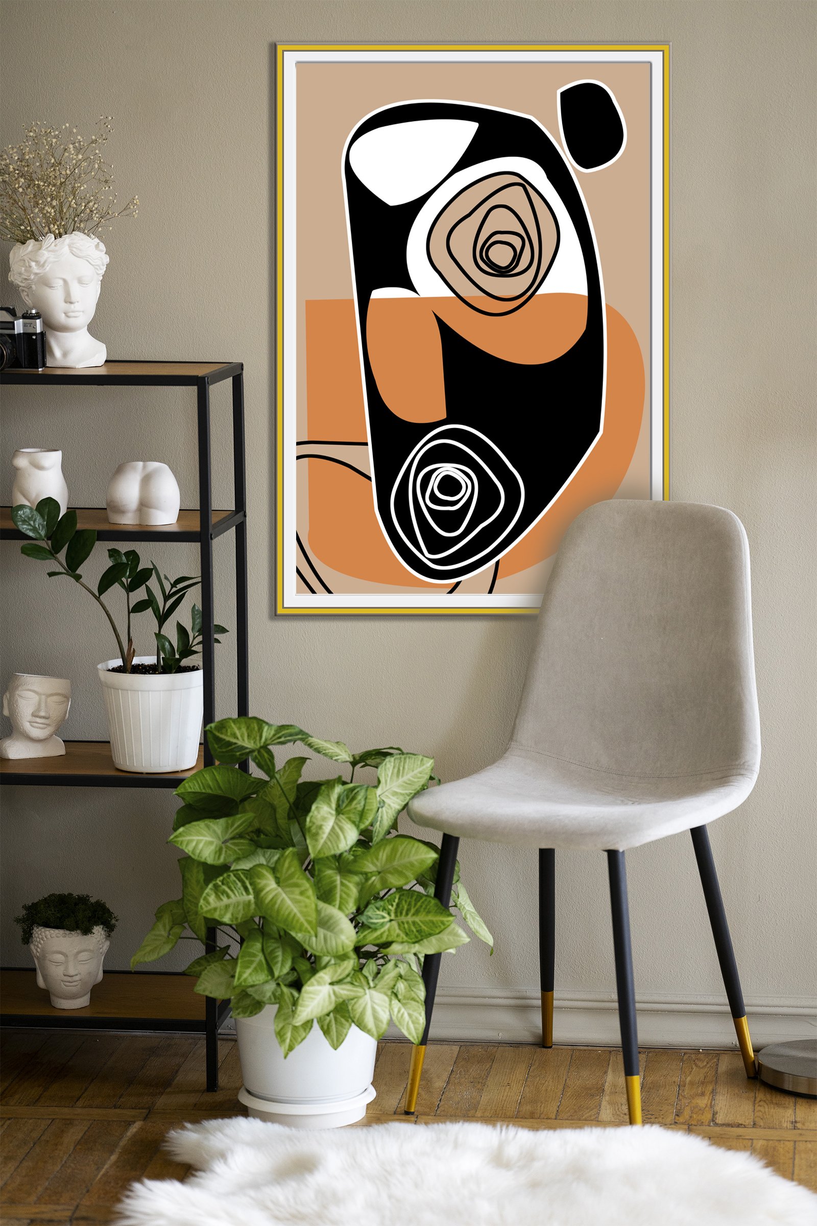 Golden Ways is a unique abstract painting work poster designed for the modern art collector. This piece brings a sense of sophisticated balance to any interior space. The artwork showcases a beautiful blend of organic movement and bold, structured geometry. You can immediately see how the earthy tones ground the composition while the black shapes provide a powerful focal point.