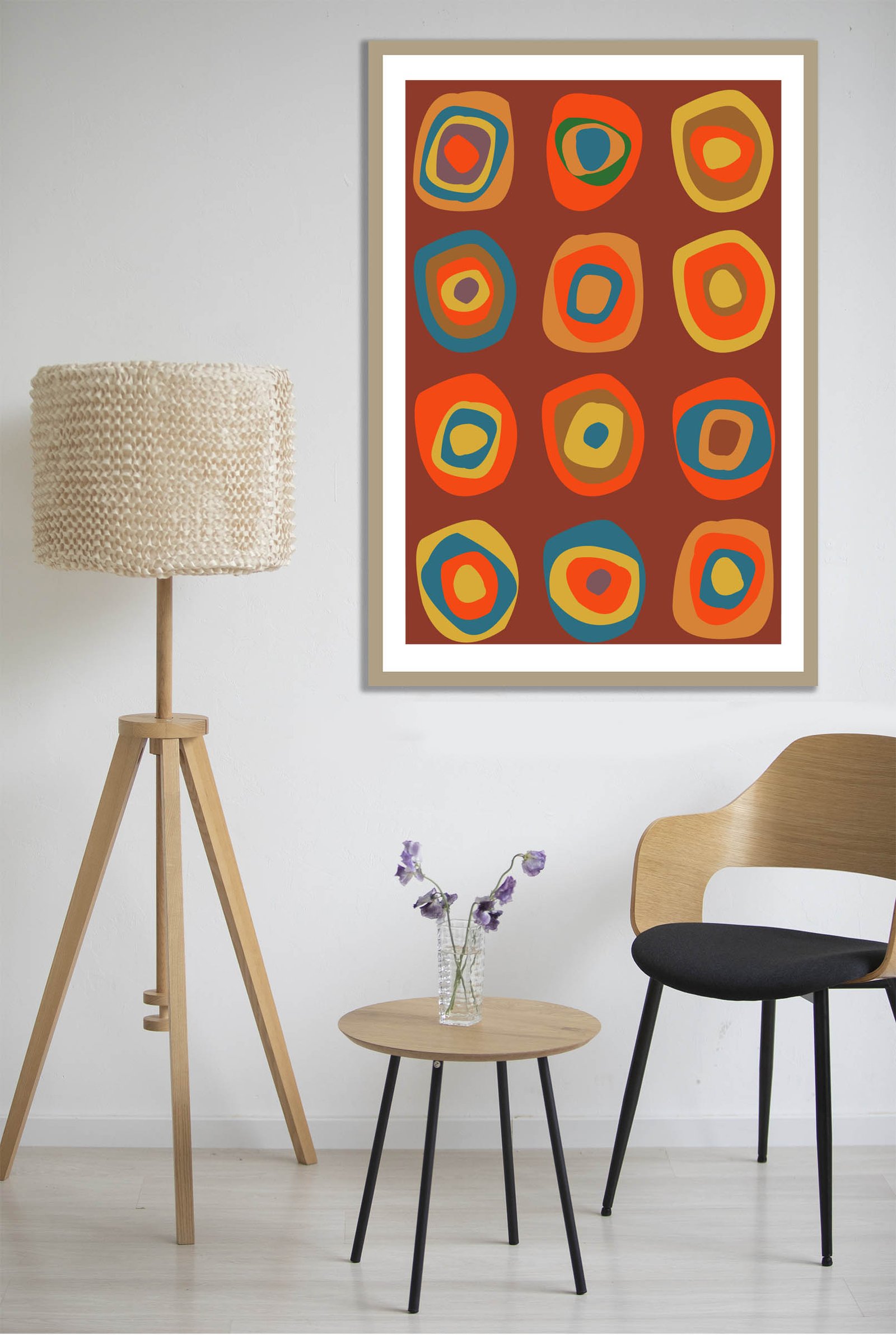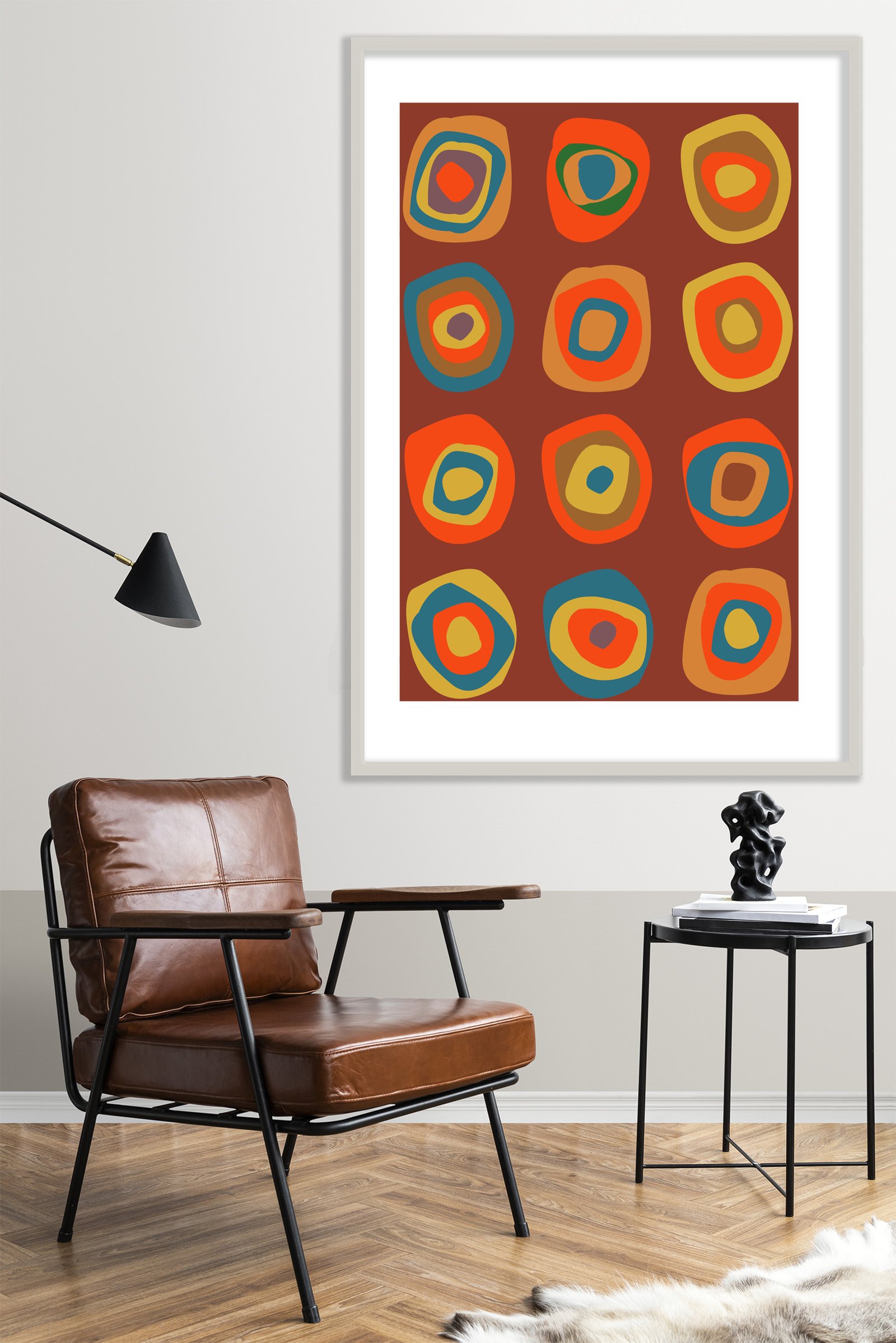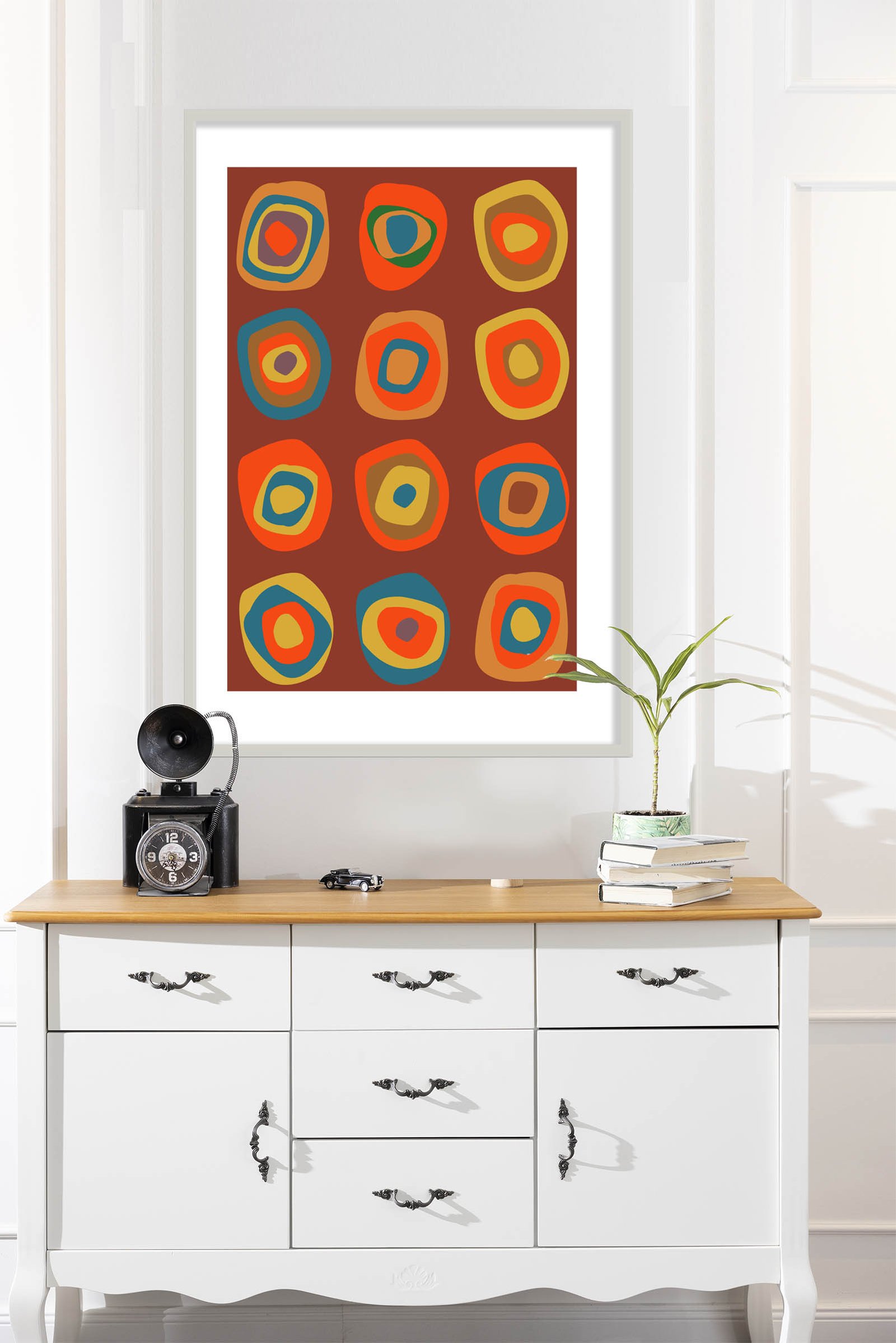 The artwork features twelve unique, hand-painted circles. I chose a rich palette of terracotta, mustard yellow, and deep teal. These earthy tones sit perfectly on a warm rust-red background. The organic shapes create a sense of movement across the grid. This design draws inspiration from mid-century modern aesthetics and classic abstract expressionism.