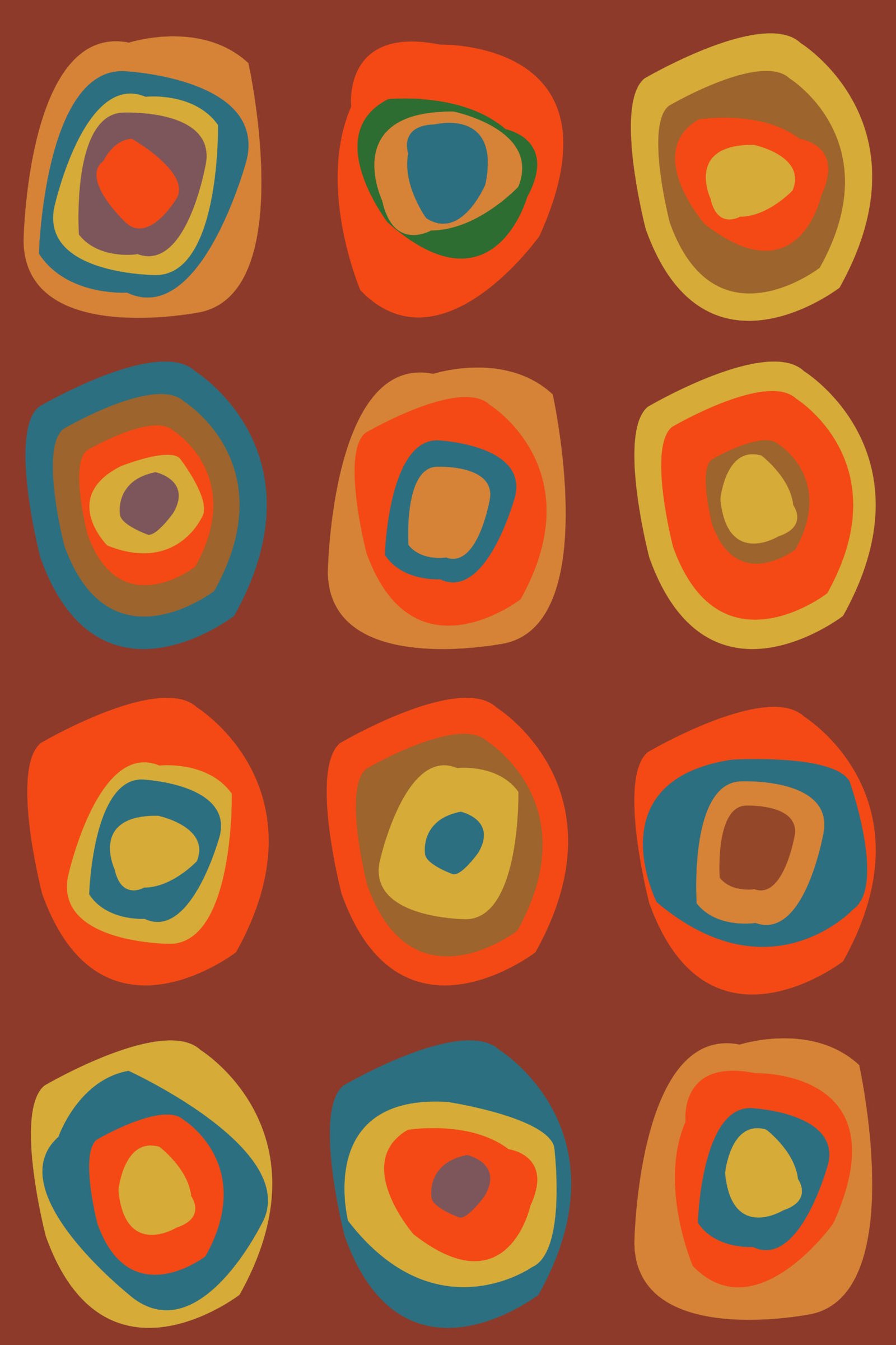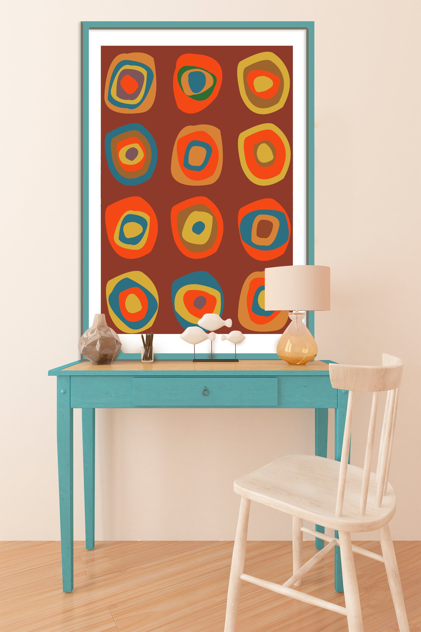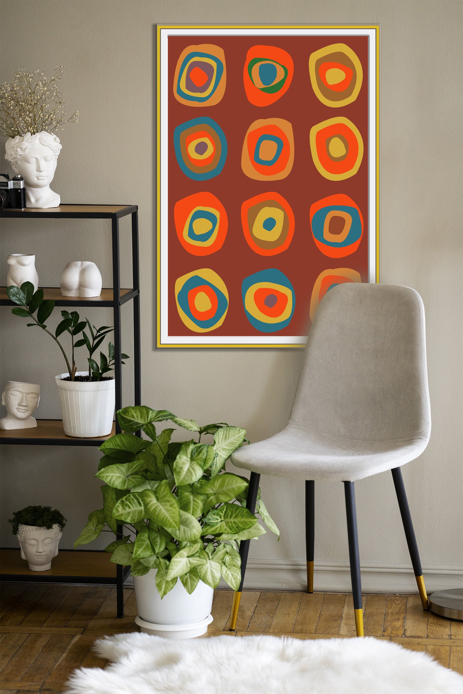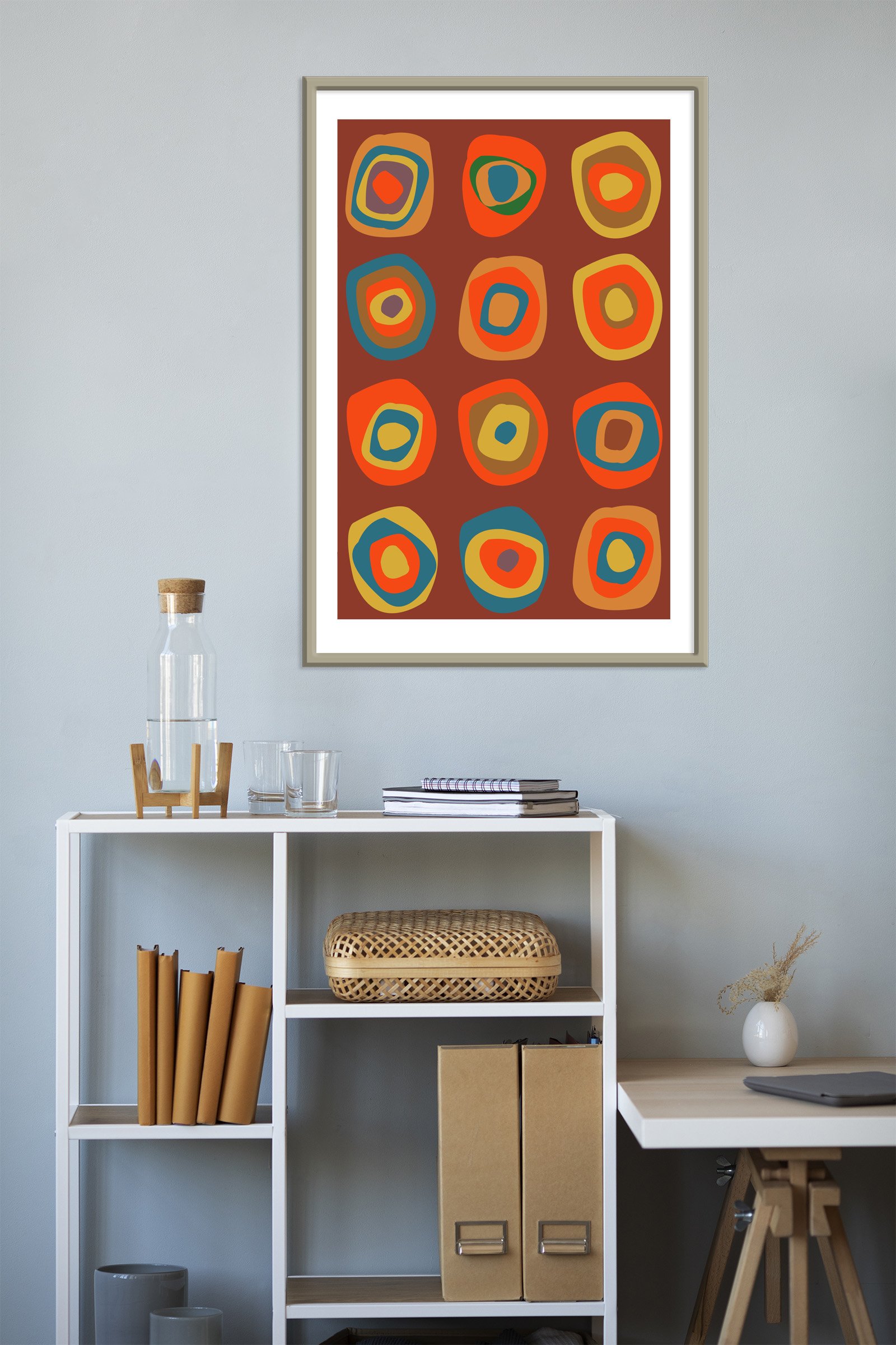 The artwork features twelve unique, hand-painted circles. I chose a rich palette of terracotta, mustard yellow, and deep teal. These earthy tones sit perfectly on a warm rust-red background. The organic shapes create a sense of movement across the grid. This design draws inspiration from mid-century modern aesthetics and classic abstract expressionism.